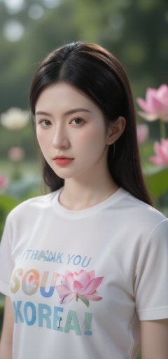 A 22-year-old South-Asian girl with a stunning face featuring sharp cheekbones, thin eyebrows, and long lashes. Her wavy, dense black hair cascades down her back like a waterfall. A friendly beautiful smile plays on her lips, painted a soft pink. She wears a crisp white t-shirt with bold typography text with colors inspired by South Korean flag reading '/THANK YOU SOUTH KOREA!/' across the chest. The serene garden background features lush greenery and vibrant flowers, including a majestic lotus at its center. Effect: HDR, Highly detailed.