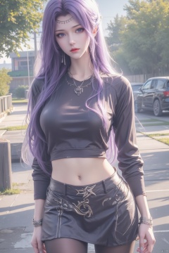 1girl, solo, long hair, breasts, looking at viewer, skirt, navel, cleavage, jewelry, standing, purple eyes, purple hair, pantyhose, earrings, outdoors, midriff, bracelet, tree, black pantyhose, road, street