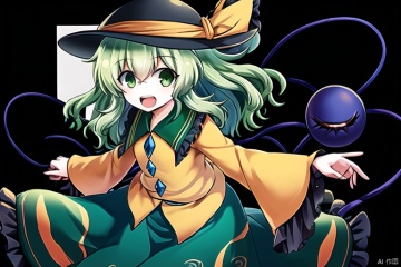 ,simple background,komeiji koishi,1girl, hat,hat bow,green hair,green eyes,yellow shirt,green skirt,,long sleeves, wide sleeves, floral print,third eye,eyeball,cute,white background,