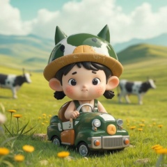 Blind box doll,1girl, solo, black hair, hat, twintails, sitting, flower, outdoors, day, black eyes, grass, ground vehicle, child, motor vehicle, cow print, field, cow