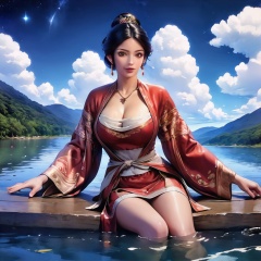 1girl,jewelry,solo,sky,sitting,black hair,necklace,realistic,breasts,earrings,water,lake,cleavage,looking at viewer,wide sleeves,cloud,outdoors,brown eyes,dress,hair bun,large breasts,lips,<lora:lora.by_tusi:0.8>,