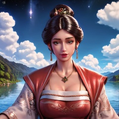 score_9, score_8_up, score_7_up,beautiful,pretty,intricate details,hyper-detailed,absurdres,wallpaper,incredibly absurdres,huge filesize,HDR,UHD,8K,best quality,masterpiece,Highly detailed,beautiful,intricate details,hyper-detailed,1girl,jewelry,solo,sky,sitting,black hair,necklace,realistic,breasts,earrings,water,lake,cleavage,looking at viewer,wide sleeves,cloud,outdoors,brown eyes,dress,hair bun,large breasts,lips,<lora:lora.by_tusi:0.8>,