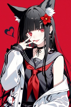 1girl, solo, long hair, looking at viewer, blush, smile, bangs, shirt, black hair, hair ornament, red eyes, long sleeves, bow, ribbon, animal ears, jewelry, school uniform, collarbone, jacket, upper body, flower, hair bow, heart, parted lips, serafuku, choker, tongue, hairclip, hand up, hair flower, tongue out, blunt bangs, sailor collar, off shoulder, nail polish, neckerchief, animal ear fluff, book, black shirt, v, black bow, black choker, stuffed toy, ring, white jacket, stuffed animal, red flower, lace trim, lace, red nails, red background, red neckerchief, black sailor collar, black serafuku, hime cut, stuffed bunny, book stack