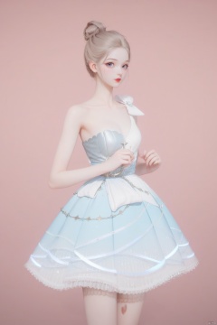 score_10、score_9_up、score_8_up、score_7_up,1girl, solo, looking at viewer, blonde hair, dress,bare shoulders, collarbone, weapon, hair bun, strapless, single hair bun,  strapless dress, red lips, ballerina