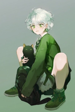 1girl, cat, green eyes, black cat, shoes, white hair, backpack, socks, looking at viewer, jacket, solo, sitting, sneakers, bag, bangs, green jacket, medium hair, animal, green theme, crossed legs, green socks, shirt