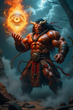 A high-definition retail packaging style camera shot of the 'Eye of Wisdom', an ancient artifact with a crystalline iris that gleams with a knowing light. The artifact is depicted in a realistic, detailed style, its borders crisp and clear. The Eye is set against a mysterious background, exuding an aura of insight and foresight. Surrounding it is a fierce Japanese oni with a muscular, burly build, oiled skin, and an expression of raw anger. The oni's thick body and strong arms are highlighted with shadows and fiery light, adding to the epic, heroic vibe. His body is adorned with traditional accessories, and the scene includes dramatic lighting effects with clouds and fog for added intensity. The oni's powerful stance and the Eye's mystical glow create a vivid, dynamic composition reminiscent of wildlife photography with a strong fighter aesthetic