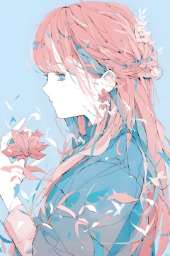 Anime illustration girl with pink hair and blue eyes wearing a blue dress with red accents holding a pink flower in her hand surrounded by scattered leaves soft pastel colors serene expression side profile light blue background delicate floral hair accessories gentle and ethereal atmosphere., 1girl, jewelry, earrings, blue eyes, flower earrings, from side, long hair, upper body, profile, petals, shirt, multicolored hair