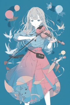 Anime illustration young woman with long blonde hair wearing a blue and pink dress holding a pink violin surrounded by flying birds and balloons blue background blue cat in the foreground playful and whimsical atmosphere soft pastel colors dynamic and energetic pose full-body shot slight downward angle gentle expression., 1girl, violin, instrument, skirt, solo, bow \(music\), shirt, holding, blue background, music, long sleeves, holding instrument, blue eyes, holding violin, playing instrument, long skirt, bird, closed mouth, simple background, neck ribbon, collared shirt, ribbon, shirt tucked in
