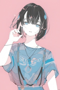 Anime-inspired illustration young woman with dark hair and blue eyes wearing a blue and white striped top with suspenders holding a hand to her ear pink background thoughtful expression soft pastel colors ethereal and serene atmosphere delicate earrings casual and relaxed pose., solo, jewelry, earrings, blue eyes, short hair, looking at viewer, parted lips, shirt, black hair, portrait, pink background, necklace, simple background