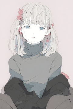 Anime drawing anime girl with blonde hair and blue eyes wearing a gray sweater with black sleeves pink flowers in her hair sitting against a light pink background looking to the side with a peaceful expression soft and calm atmosphere., 1girl, solo, flower, jewelry, earrings, flower earrings, blue eyes, portrait, hair ornament, simple background, hair flower, no pupils, turtleneck, blonde hair, sweater, medium hair, looking at viewer, jacket, parted lips, turtleneck sweater, red flower, blunt bangs, black jacket