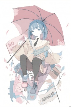 Anime illustration girl with blue hair and white face sitting on a pile of trash holding a pink umbrella surrounded by various signs and flags including one that says "No Warrier" and "PRING" on it wearing a black and white outfit holding an umbrella pink background soft pastel colors casual and playful mood., 1girl, solo, necktie, headphones, shirt, headphones around neck, white background, sign, flat color, blue hair, black necktie, jacket, shoes, simple background, collared shirt, yellow jacket, looking at viewer