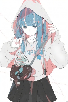 Anime artwork anime character with blue hair and white and pink outfit holding a bow and a chameleon standing against a white background with pink lines holding the bow with one hand wearing a black and pink bag with "IRONRO" on the bag looking over shoulder playful and cheerful expression soft pastel colors., 1girl, solo, skirt, hood, hoodie, blue hair, bag, black skirt, long sleeves, looking at viewer, white background, jewelry, pleated skirt, earrings, sleeves past wrists, hand up