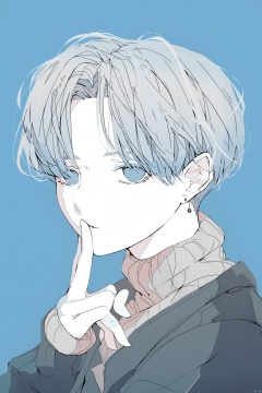 Anime drawing anime boy with light blonde hair and blue eyes wearing a black jacket holding a finger to his lips blue background soft lighting neutral expression side profile hand near mouth earring in ear light blue eyes., solo, finger to mouth, jewelry, blue background, short hair, blue eyes, simple background, earrings, looking at viewer, portrait, grey hair, sweater, shushing, jacket, index finger raised, 1boy, 1girl, male focus