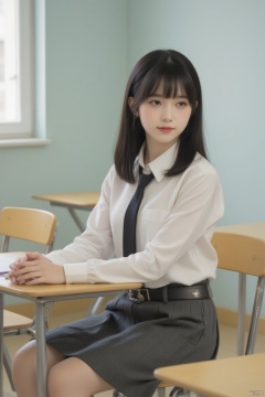 The subject of the photo is a young female wearing a school uniform, seated at a desk in a classroom. Her hands are folded on the table in front of her, and her body is slightly leaning forward, indicating that she is attentively listening or thinking. Her eyes are fixed on the camera, and her expression is calm. (Smiling expression:1.2),Her school uniform consists of a white long-sleeved shirt and a dark gray skirt with a belt, and a black tie is tied at the collar. Her hair is black, falling over her shoulders, and her bangs are neatly trimmed. The background of the photo is a bright classroom with light visible through the windows, the walls are light blue, and the desks are yellow,gongbi