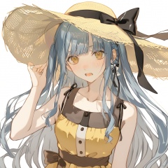1girl, solo, long hair, open mouth, bangs, hat, bow, brown eyes, blue hair, yellow eyes, upper body, hair bow, teeth, two side up, white headwear, wavy hair,7y.o.,Straw Hat