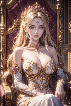 1girl, solo, long hair, breasts, looking at viewer, blue eyes, blonde hair, large breasts, dress, cleavage, bare shoulders, jewelry, sitting, earrings, detached sleeves, indoors, white dress, lips, chair, throne