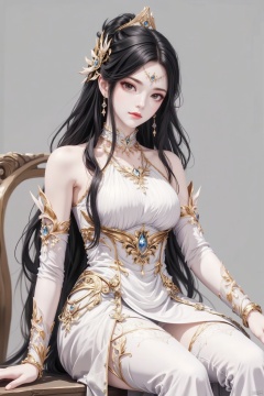 1girl, solo, long hair, looking at viewer, black hair, hair ornament, thighhighs, dress, bare shoulders, jewelry, sitting, earrings, detached sleeves, white dress, bracelet