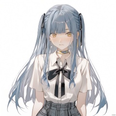 1girl, solo, long hair, looking at viewer, bangs, skirt, (((white shirt,)))  white background, ribbon, blue hair, hair ribbon, yellow eyes, braid,  two side up, plaid, black ribbon, grey skirt, shirt tucked in