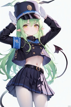 nai3,( beautiful),(high quality),(finely detailed),extremely detailed CG unity 8k wallpaper,best quality, 1girl, solo, long hair, looking at viewer, blush, bangs, skirt, simple background, gloves, long sleeves, hat, white background, navel, hair between eyes, very long hair, jacket, tail, yellow eyes, pantyhose, sidelocks, cowboy shot, pleated skirt, green hair, pointy ears, midriff, belt, white gloves, black skirt, uniform, arms up, black jacket, crop top, v-shaped eyebrows, black headwear, demon tail, armband, peaked cap, white pantyhose, black belt, ((green halo)), hikariBA, :<
