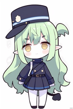 (best quality), ((masterpiece)), (highres),standing,original, extremely detailed wallpaper, (an extremely delicate and beautiful),(loli:1.2),(petite:1.2),(solo),sky, skyline, skyscraper, smile, solo, sunflower, tower, upper_body,white flower,chibi,long hair, bangs, skirt, gloves, long sleeves, hat, jacket, tail, yellow eyes, pantyhose, pleated skirt, green hair, pointy ears, belt, white gloves, black skirt, bag, uniform, black jacket, black headwear, halo, demon tail, armband, peaked cap, whitepantyhose, sidelocks, cute, wavy_hair, white pantyhose, :<, v-shaped eyebrows, arms up, handsup,roundface,highlander,hikariBA