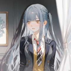 1girl, solo, long hair, blush, bangs, shirt, long sleeves, ribbon, very long hair, school uniform, standing, jacket, hair ribbon, yellow eyes, white shirt, upper body, grey hair, sidelocks, parted lips, open clothes, necktie, day, striped, collared shirt, indoors, blunt bangs, open jacket, two side up, looking to the side, window, black ribbon, looking away, sunlight, blazer, curtains, black necktie, grey jacket, arms at sides, striped necktie, diagonal-striped necktie