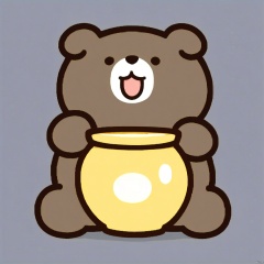 bestquality, 1 cartoon bear, no human, solo, laughing, round face, small black eyes, dumpy body, playing with a honey pot, cartoon