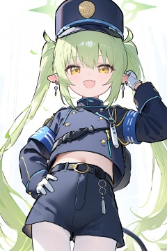 1girl, solo, long hair, looking at viewer, blush, smile, open mouth, bangs, gloves, long sleeves, hat, navel, hair between eyes, twintails, jewelry, very long hair, jacket, tail, yellow eyes, pantyhose, earrings, green hair, shorts, pointy ears, fang, midriff, belt, white gloves, uniform, hand on hip, halo, demon tail, armband, peaked cap, skin fang, white pantyhose, light green hair,nozomiBA
