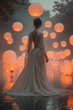 Elegant photo of the outdoors ,A serene scene of a woman in traditional attire, standing amidst floating lanterns on what appears to be an ethereal body of water.