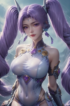 score_9, score_8_up, score_7_up,highly detailed digital,1girl, solo, long hair, looking at viewer, large breasts, twintails, jewelry, very long hair, purple eyes, purple hair,,She has pale, almost translucent skin,1girl,meidusha