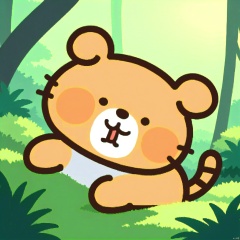 bestquality, 1 orange cartoon tiger, no human, solo, fierce expression, round face, small black eyes, dumpy body, cartoon, prowling through the jungle.