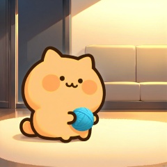 bestquality, 1 orange cartoon kitten, no human, solo, curious expression, round head, small black eyes, chubby body, playing with a ball of yarn, in a cozy living room