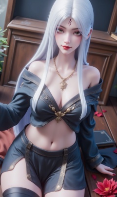 8K image. ((poakl)),white hair,Flux小白-起风,1girl, solo, long hair, breasts, looking at viewer, skirt, shirt, thighhighs, navel, cleavage, bare shoulders, jewelry, medium breasts, sitting, closed mouth, collarbone, flower, white hair, midriff, black thighhighs, indoors, black skirt, necklace, off shoulder, stomach, crop top, grey eyes, book, petals, black shirt, makeup, facial mark, lipstick, red flower, single thighhigh, pale skin, forehead mark, red lips, book stack,