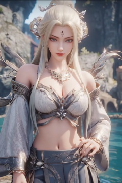 1girl, solo, long hair, breasts, looking at viewer, blue eyes, skirt, blonde hair, large breasts, hair ornament, navel, cleavage, bare shoulders, jewelry, wings, water, bracelet, red lips,qdf,	forehead mark,white hair