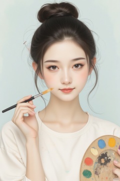 A charming portrait of a young woman with her hair in a casual bun, holding a paintbrush and an artist's palette. The woman has soft, colorful paint strokes on her face, neck, and chest, and she playfully touches her cheek with the paintbrush. She is wearing a simple white top, and the background is a solid light blue. The image conveys a lighthearted, creative atmosphere, with pastel-colored paint strokes adding an artistic, whimsical feel. The lighting is soft, highlighting her clear skin and gentle smile, making the overall mood fun and inspiring.