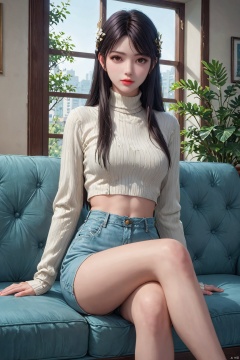 score_9,score_8_up,score_7_up,XXE,1girl, solo, long hair, looking at viewer, bangs, black hair, hair ornament, long sleeves, navel, brown eyes, sitting, closed mouth, shorts, midriff, indoors, sweater, lips, parted bangs, short shorts, bare legs, window, feet out of frame, turtleneck, crossed legs, plant, couch, turtleneck sweater, realistic, nose, white sweater, midriff peek