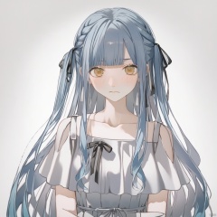 akiko,1girl, solo, long hair, looking at viewer, blush, bangs, simple background,, ribbon, blue hair, grey hair,collarbone, hair ribbon, yellow eyes, braid,, blunt bangs, two side up, black ribbon,cowboy shot,upper body,