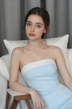 a young europe woman is seated on a white chair. She is wearing a light blue strapless dress with a white stripe down the center of her chest. Her hair is pulled back in a ponytail, and her eyes are a piercing blue. She has a pearl necklace around her neck, adding a touch of charm to her outfit. The backdrop is a gray curtain, and a white pillow is behind her.