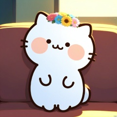 bestquality, 1 cute white cartoon cat, no human, solo, sitting on the couch, round face, small black eyes, dumpy body, flower crown, cartoon