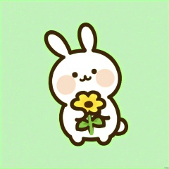 bestquality, 1 white cartoon bunny, no human, solo, sweet smile, round cheeks, large black eyes, petite chubby body, cartoon, with a big bow, holding a flower, light green background.