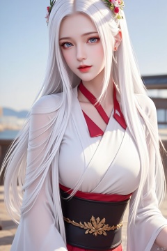 A girl with long white hair is depicted in a close-up shot. She is wearing a white kimono with a red sash around her neck and a black belt with gold embroidery on it. Her eyes are blue and her hair is cascading down her shoulders. She has a flower crown on her head, adding a touch of color to her outfit. The background is blurred, suggesting a natural setting.
