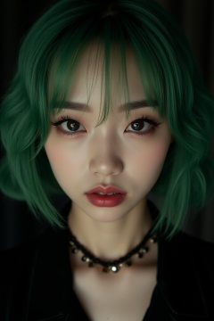 ((top quality)), ((masterpiece)), close portrait of a young gothic chinese girl with a  touch of punky, ((front view,)) With a black velvet unbuttoned shirt, with a rebellious appearance, black shaded eyes, green hair, intricate details, highly detailed light brown eyes, highly detailed mouth, cinematic image, illuminated by soft light,photo of perfecteyes eyes