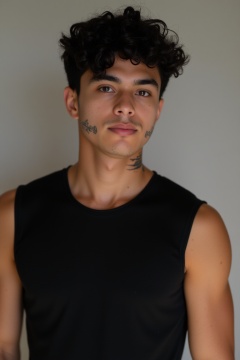messy hair, guy, boy, tan skin, middle part hair, black hair, brown eyes, abs, muscular, tan, guy, boy, teenager, middle part, neck tatoos, black sleeveless compression shirt, short hair, middle part hair, t-shirt, curls, black shirt, handsome, no_sleeves, sleeveless, compression shirt, tights, t-shirt, handsome,
