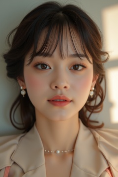 Beautiful, soft light, (beautiful and delicate eyes), very detailed, pale skin, big smile, (long hair), dreamy, medium chest, female 1, ((front shot)), bangs, soft expression, height 170, elegant , Bright smile, 8k art photo, photorealistic concept art, realistic, person, small necklace, small earrings, fantasy, jewelry, shyness, dreamy soft image, masterpiece, ultra high resolution, skirt, shirt, jacket, color , (both eyes (He gently closes his eyes, raises his head slightly, and appears absorbed in pleasant thoughts),dragon