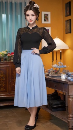 1girl,solo,table,brown hair,full body,mamian skirt,black footwear,dress,standing,single hair bun,indoors,looking at viewer,long sleeves,hair ornament,shoes,<lora:仙逆-王林-马良-李慕婉合一:0.73>,reality,