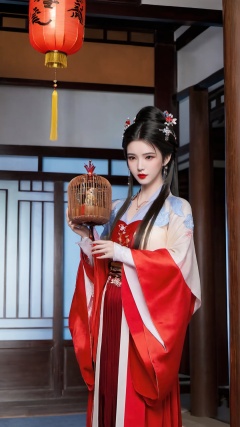 1girl,solo,holding,hanfu,jewelry,long hair,hand fan,chinese clothes,necklace,long sleeves,hair ornament,holding fan,basket,brown hair,standing,black hair,wide sleeves,red lips,<lora:仙逆-王林-马良-李慕婉合一:0.73>,traditional_chinese_room,incredibly absurdres,photo_(medium),