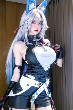 1girl solo long hair breasts looking at viewer blue eyes gloves animal ears bare shoulders white hair shorts sleeveless black gloves belt indoors ground vehicle