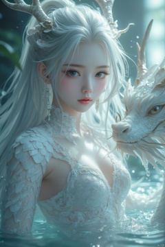 beautiful Detail eyes, beautiful detail face, ((antlers)), Water drops on body, (next to a white jade dragon),