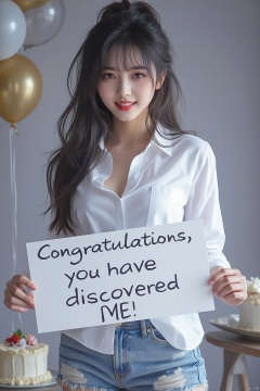 1girl, solo, young girl, happy expression, looking at viewer, upper body, (long hair, black hair, bangs, brown eyes:1.3), big breasts, cleavage, white shirt, short jeans, holding a sign that says "Congratulations, you have discovered me!", balloons, cake, party,
