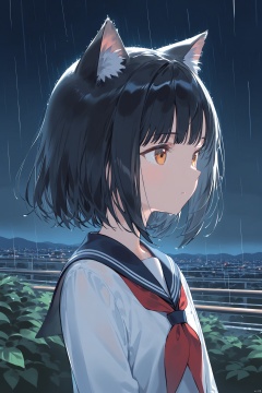 animal_ears, 1girl, black_hair, sailor_collar, solo, short_hair, cat_ears, school_uniform, serafuku, black_sailor_collar, upper_body, rain, shirt, white_shirt, long_sleeves, night, closed_mouth, scenery, bangs