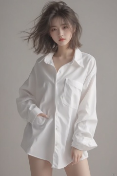 1girl is wearing a white boyfriend shirt,Shoulders and legs exposed,